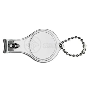 Cortador de unhas chaveiro de metal 3 em 1: abridor, cortador e lixa. Parte central circular ideal para gravações, detalhe de traços no contorno circular. Lado frontal com detalhes em relevo nas laterais e pequeno círculo acima do abridor. Para utilizar o cortador basta rotacionar a peça circular e levantá-la. Acompanha correntinha.