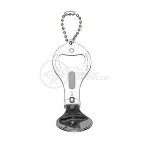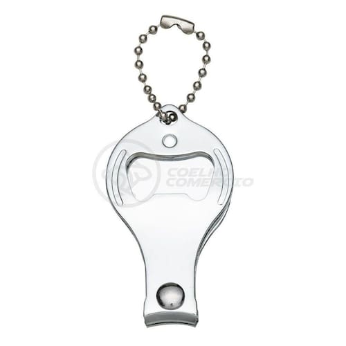 Cortador de unhas chaveiro de metal 3 em 1: abridor, cortador e lixa. Parte central circular ideal para gravações, detalhe de traços no contorno circular. Lado frontal com detalhes em relevo nas laterais e pequeno círculo acima do abridor. Para utilizar o cortador basta rotacionar a peça circular e levantá-la. Acompanha correntinha.
