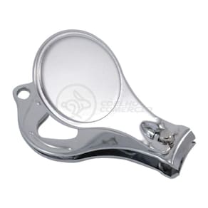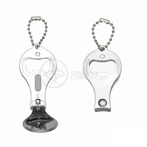 Cortador de unhas chaveiro de metal 3 em 1: abridor, cortador e lixa. Parte central circular ideal para gravações, detalhe de traços no contorno circular. Lado frontal com detalhes em relevo nas laterais e pequeno círculo acima do abridor. Para utilizar o cortador basta rotacionar a peça circular e levantá-la. Acompanha correntinha.