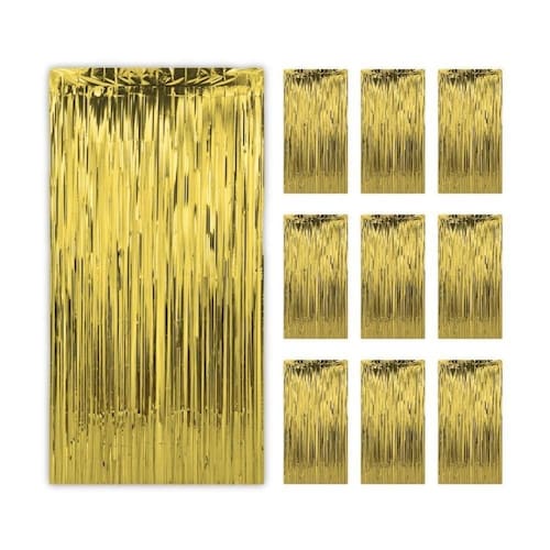 Conjunto com 10 cortinas de fitas metalizadas douradas com dimensões de 1 metro por 2 metros cada, oferecendo ampla cobertura decorativa.