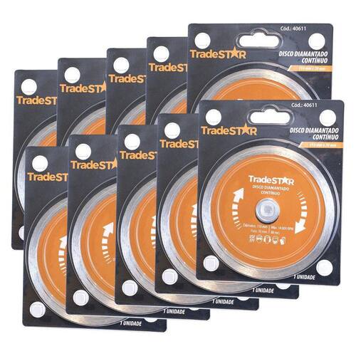 Kit 10 discos corte diamantado contínuo 115 x 20mm Disco diamantado contínuo 110x20 mm para cortes precisos em materiais duros Com o disco diamantado contínuo 110x20 mm, você pode realizar cortes precisos em materiais duros, como cerâmica, granito, mármore, entre outros. Sua estrutura contínua garante um corte mais suave e evita quebras e desgastes prematuros. O disco é indicado para uso em máquinas de corte a seco ou refrigerado, e possui diâmetro de 110 mm e espessura de 20 mm, o que o torna ideal para trabalhos que exigem precisão e acabamento de qualidade. Confira algumas vantagens de comprar com a jjc ferramentas: Qtde por embalagem - 1 kit com 10 unidades Garantia 90 dias após a compra. Imagens meramente ilustrativas As tonalidades da cor do produto podem sofrer alterações de acordo com a tela que estiver usando para visualização. Vantagens de comprar com a jjc ferramentas: Experiência e confiança: somos especialistas em ferramentas e acessórios, garantindo produtos de qualidade e desempenho superior. Variedade e qualidade: oferecemos uma seleção abrangente de ferramentas, sempre priorizando a durabilidade e eficiência. Atendimento personalizado: nossa equipe está pronta para ajudá-lo, oferecendo suporte técnico e orientações precisas. Entrega rápida: garantimos uma logística eficiente, assegurando que seu pedido chegue no menor tempo possível. Satisfação garantida: se por algum motivo não ficar satisfeito, oferecemos política de devolução sem complicações. Marca: Tradestar Ean: 7898751381294