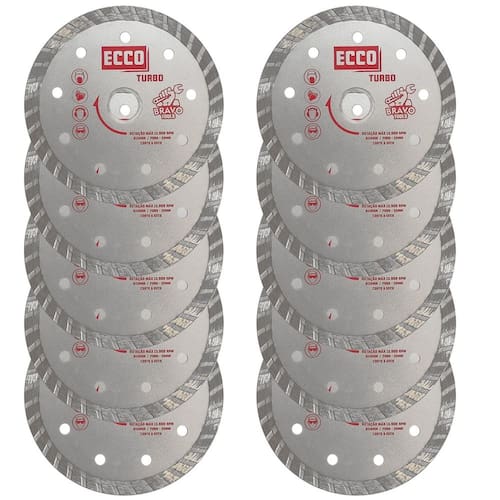 Kit com 10 Discos De Corte Diamantado Turbo 110mm X 20mm Bravo Tools Disco de Corte Diamantado Turbo 110mm indicado para corte com Serra Mármore Makita . Corte a seco ou úmido em concreto baixo MPA, alvenaria, tijolo, telha, ardósia e cerâmica. - Marca: Bravo Tools - Referência: BV8ET - Kit exclusivo com 10 discos turbo - Diâmetro: 110 mm - Furo: 20mm - Acompanha anel para 16mm 5/8 Pol. - Altura da borda de corte: 2.2mm - Largura da borda de corte: 8mm - Rotação máxima: 13.900 rpm - Combina cortes rápidos e acabamento - Corte a seco ou úmido - Indicador para corte sem água em Concreto baixo MPA, alvenaria, tijolo, telha, ardósia e cerâmica - Indicado para corte com água em concreto alto MPA, mármore e granito.- Use sempre EPI - Peso: 95 gramas Marca: Não Informado