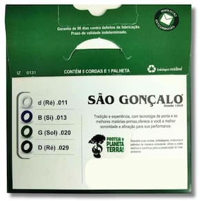 Kit 10 Encordoamento Cavaco Níquel Com bolinha São Gonçalo 0.011 - 0.029 Descrição: As cordas São Gonçalo para cavaquinho possuem um encordoamento em aço inoxidável com bolinha e são revestidas com níquel. Elas possuem uma tensão média, além de possuir uma afinação precisa e durável, o que mantém o sustain por muito mais tempo. As cordas de cavaquinho São Gonçalo são feitas apenas para esse instrumento. Neste caso, é preciso contar com um encordoamento muito leve, para obter um timbre mais aveludado. A São Gonçalo teve a sua história iniciada em 1918, em um modesto edifício na Praça Marechal Deodoro da Fonseca em e, desde então, tem oferecido ao mundo produtos da mais alta qualidade e que garantem o melhor timbre para o seu cavaquinho. Sobre nossa loja: Somos a E Musical loja de instrumentos e acessórios musicais. Contamos com mais de 3 mil produtos novos e seminovos revisados e uma equipe de vendas especializada que trabalha desde 2009 no mercado da música. Estamos sempre à disposição para atender suas necessidades e exigências como músico Emusicalshop Jacareí SP Marca: Não Informado