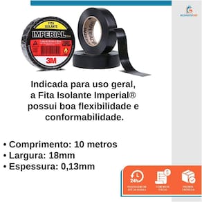A Fita Isolante Imperial® é indicada para uso geral e doméstico. É ideal para pequenos reparos elétricos, reforço em cabos de ferramenta e manutenções provisórias. Possui boa isolação térmica e flexibilidade, é resistente a raios ultravioletas e reduz a vulnerabilidade dos materiais. É fácil de aplicar e de rasgar, garantindo bons resultados e conformabilidade. Esta fita Imperial® não contém metais pesados, é antichama e fabricada no Brasil. Sua classe de tensão é de 750 V, e a classe de temperatura é 90°C. Ela é constituída por um dorso vinilíco recoberto, com uma camada de adesivo à base de borracha sensível à pressão. Para utilizar o produto no isolamento de materiais, aplique quatro camadas da fita sempre alongada 50% e em meia sobreposição em cada volta. Termine com sobreposição 100% sobre a própria fita.