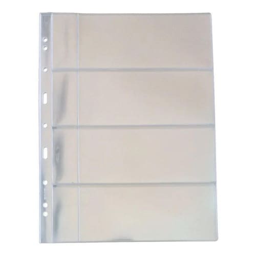Kit 10 Folhas Plastico Cédula Acetato 4 Divisões Com Bolso Folha de acetato com 4 espaços para organizar e proteger sua coleção de cédulas.