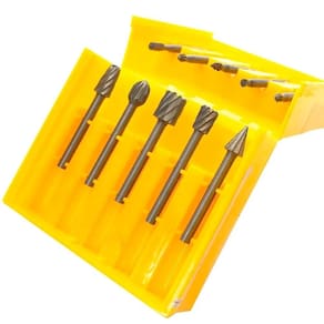 Kit com 10 Fresas Escariadoras HSS. Indicado para fresar, esculpir, perfurar, chanfrar e entalhar madeira, alumínio Leve, plástico e etc. Uso em micro retíficas Dreme, Charbs, Black+Decker e outras.
