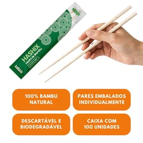 O Hashi de Bambu é a melhor escolha para restaurantes, deliveries e eventos com culinária asiática. Feito com 100% bambu natural, é mais resistente que a madeira tradicional, possui baixa absorção de líquidos (como shoyu) e não solta farpas.