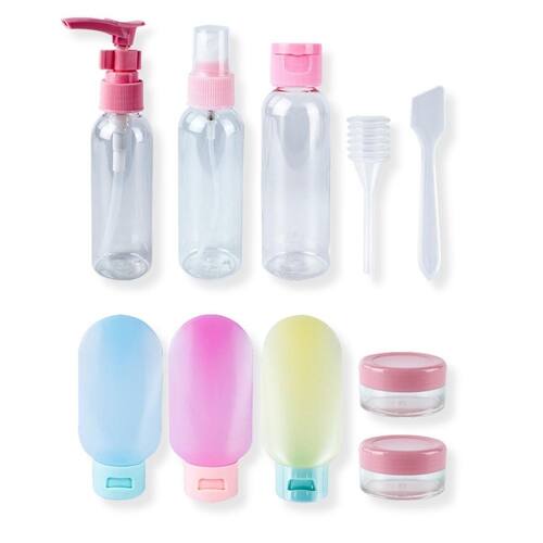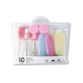 Composto por 3 bisnagas coloridas, um frasco spray, um frasco bico de pato, um frasco tampa flip-top, dois mini potes com tampa e dois utensílios plásticos para utilizar os produtos armazenados, sendo uma mini colher chanfrada e um conta gotas. O kit é fácil de higienizar e evita desperdícios, com frascos feitos de material leve e resistente, as tampas e travas são bem posicionadas evitando acidentes. Kit completo e que acompanha uma necessaire transparente para armazenar organizadamente todos eles.