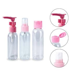 Contém: 01 - frasco spray com tampa 60ml 01 - frasco pump bico de pato com trava 60ml 01 - frasco tampa flip-top 60ml 03 - bisnagas 60ml 02 - mini potes com tampa 01 - mini colher chanfrada lisa 01 - conta gotas