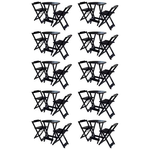 Kit 10 Jogos De Mesa Bistrô De Madeira Com 2 Cadeiras Dobravel Ideal Para Bar E Restaurante Preto é ideal para bares, restaurantes, estabelecimentos, áreas de lazer e tambem para sua casa. Feito em madeira maciça, tornando resistentes e duráveis. Seu design permite que seja encaixado em qualquer ambiente, trazendo um toque a mais para seu estabelecimento. Além de sua durabilidade, o que lhe trará conforto para servir seus clientes. Por ser dobrável torna-se mais fácil guardar, manusear e limpar o produto. Atenção: EVITE USAR PRODUTOS ABRASIVOS E QUíMICOS PARA LIMPEZA DO PRODUTO, aconselha-se o uso de pano umedecido para melhor conservação; mantenha o produto fora de chuva e sol constantes. OBS: MDF ULTRA MESA Cor: Preto Modelo: Bistrô Dobravel Dimensões: Altura 99cm | Largura 55cm | Profundidade 55cm CADEIRA Cor: Preto Modelo: Bistrô Dobravel Dimensões: Altura 100cm | Largura 38cm | Profundidade 37cm