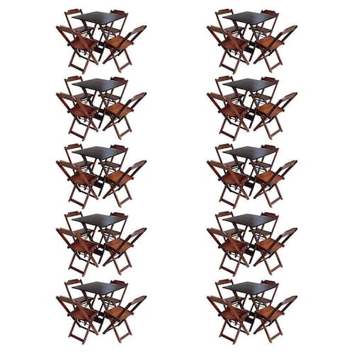 Kit 10 Jogos De Mesa Com 4 Cadeiras De Madeira Dobravel 60x60 Ideal Para Bar E Restaurante - ImbuiaÉ ideal para bares, restaurantes, estabelecimentos, áreas de lazer e tambem para sua casa. Feito em madeira maciça, tornando resistentes e duráveis. Seu design permite que seja encaixado em qualquer ambiente, trazendo um toque a mais para seu estabelecimento. Além de sua durabilidade, o que lhe trará conforto para servir seus clientes. Por ser dobrável torna-se mais fácil guardar, manusear e limpar o produto.Atenção: EVITE USAR PRODUTOS ABRASIVOS E QUÍMICOS PARA LIMPEZA DO PRODUTO, aconselha-se o uso de pano umedecido para melhor conservação; mantenha o produto fora de chuva e sol constantesMESACor: ImbuiaModelo: DobravelDimensões: Altura 76cm | Largura 60cm | Profundidade 60cmCADEIRACor: ImbuiaModelo: DobravelDimensões: Altura 80cm | Largura 45cm | Profundidade 42cmKit 10 Jogos de Mesa com 4 Cadeiras de Madeira Dobravel 60x60 Ideal para Bar e Restaurante - Imbuia Marca: Preguiçosa