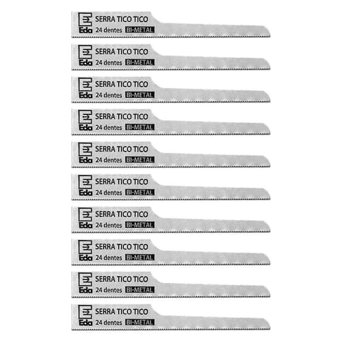 Kit 10 Lâminas para Serra Tico-Tico Pneumática Bimetal 24D EDA- Marca Eda- Referência: 9YL-2X- Kit com 10 Lâminas de serra tico-tico pneumática- Material: Aço Bimetal- Lâmina com 24 dentes- Ideal para corte de metais, fibra de vidro e plásticos- Medidas 9.35 x 12.5 x 0.6 mm- Peso bruto: 25 gramas- Garantia: 90 dias contra defeitos de fabricação