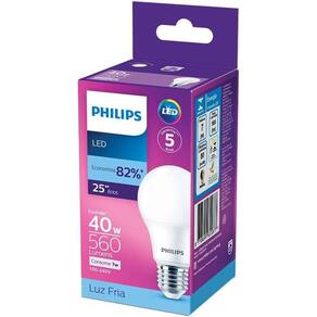 Lâmpada Led Philips bivolt base E27 Garantia: 5 anosCaracterísticas da lâmpada:- Formato - bulbo (A60)- Base/encaixe - E27- Não dimerizável- Voltagem - Bivolt 100 - 240 V- Potência em watts - 7W- Equivalente em Watts - 40 WCaracterísticas da luz:- Emissão de luz - 560 lumens- Índice de reprodução de cor (CRI) - 80- Vida útil: 25.000 horas As Standard LED bulbs são compatíveis com as instalações existentes com base E27 e foram desenvolvidas para substituição das lâmpadas halógenas incandescentes e de economia de energia. Elas oferecem uma enorme economia de energia e minimizam os custos de manutenção. A Standard LED bulb é a lâmpada perfeita para suas necessidades básicas de iluminação e oferece uma luz agradável e o desempenho que você espera de uma tecnologia LED com preço acessível.BenefíciosEssa lâmpada, com design autêntico e elegante, é uma substituição perfeita para as lâmpadas foscas convencionais.Até 90% de economia de energia em comparação com as lâmpadas incandescentes tradicionaisLonga vida útil e menores custos de manutençãoCaracterísticasFácil retrofit com os soquetes E27 existentesIluminação plena instantânea: as lâmpadas de LED Philips oferecem um nível pleno de iluminação assim que ligadas.Longa vida útil e ótima qualidade de luzDisponíveis em 3.000K e 6.500KIluminação sem ultravioleta e infravermelhoAplicaçõesHotéis, restaurantes, bares, cafésQuartos de hotel, saguões, corredores, escadas, banheiros