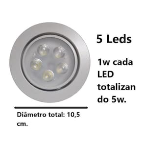 alta eficiência, alto brilho, ampla voltagem. Favorável ao meio ambiente, não contém mercúrio,cinza, sem interferência eletromagnética. Características: quantidade de leds:5 x 1w. Voltagem: ac85-265v bivolt . Luminosidade: 560 lumens. Angulo de abertura: 45 graus. Tempo de uso aproximado: 50. 000 horas. Peso: 110 gramas. Altura: 3,7 cm. Diâmetro total: 10,5cm. Diâmetro do furo: 7,5 cm. Feixe de luz direcionável. Cor: 3200k branco quente. Já vai com reator instalado, somente necessário fazer a ligação dos fios na sua instalação. Modelo com base redonda. Compra garantida:
