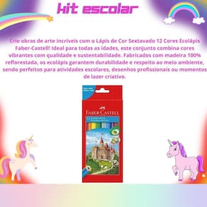 BenefíciosCores Vibrantes: Intensidade ideal para desenhos e ilustrações cheios de vida.Sustentabilidade: Produzidos com madeira 100% reflorestada, ajudam na preservação do meio ambiente.Durabilidade Superior: Minas resistentes à quebra para um uso prolongado.Conforto e Precisão: Formato sextavado que facilita a pega e evita que o lápis role na mesa.CaracterísticasFormato: Sextavado para maior ergonomia e estabilidade.Quantidade de Cores: 12 tons vibrantes e intensos.Material: Madeira reflorestada e pigmentos de alta qualidade.Resistência: Minas resistentes à quebra para garantir mais segurança e durabilidade.EspecificaçõesMarca: Faber-Castell.Uso: Ideal para atividades escolares, artísticas e profissionais.Composição: Madeira 100% reflorestada, pigmentos e adesivos não tóxicos.Certificação: Produto sustentável, reconhecido por práticas ecológicas.Conteúdo da Embalagemkit 10 Unidades de Lápis de Cor Sextavado Ecolápis Faber-Castell em tons vibrantes.Por que escolher o Ecolápis Faber-Castell?Sustentabilidade e Qualidade: Perfeito para quem busca criar sem abrir mão da responsabilidade ambiental.Reconhecimento Mundial: A Faber-Castell é referência global em materiais artísticos e escolares.