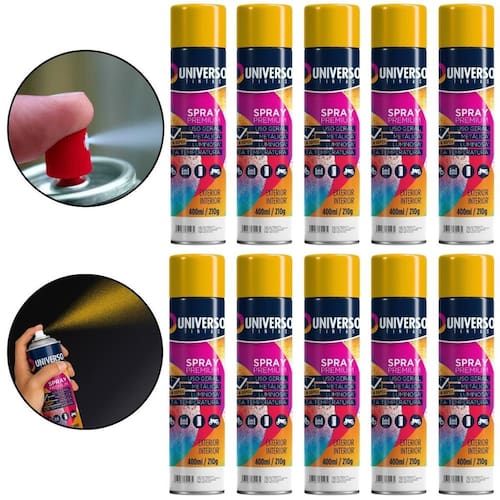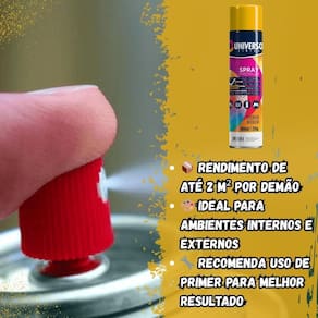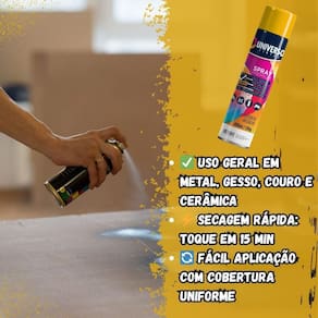 Tinta Spray 400ml Amarelo Uso Geral em Aço Ferro Couro Gesso Cerâmica A Tinta Spray 400ml Amarelo Uso Geral é a solução prática para renovar superfícies de metal, gesso, couro e cerâmica. Ideal para dar vida nova a bicicletas, móveis, eletrodomésticos e objetos em geral, garantindo um acabamento moderno e duradouro. Com fórmula de alta qualidade, oferece excelente aderência e acabamento Brilhante, além de resistência superior contra desgastes do dia a dia. Sua cobertura uniforme realça os detalhes e proporciona um resultado em poucas camadas. Prática e fácil de aplicar, a tinta spray seca ao toque em apenas 15 minutos, permitindo agilidade nos trabalhos e economia de tempo. O rendimento de até 2 m por demão garante maior aproveitamento do produto e ótimo custo-benefício. Diferenciais: Acabamento Brilhante com ótima aderência Alta durabilidade e resistência em ambientes internos e externos Secagem rápida e aplicação prática com cobertura uniforme Especificações TÉCNICAS: Volume: 400ml Rendimento: até 2 m por demão Superfícies indicadas: metal, gesso, couro e cerâmica Secagem: toque em 15 minutos Acabamento: Brilhante Recomendação: uso de primer para melhor desempenho Itens INCLUSOS: 10 Tintas Spray 400ml Amarelo Uso Geral Marca: Não Informado
