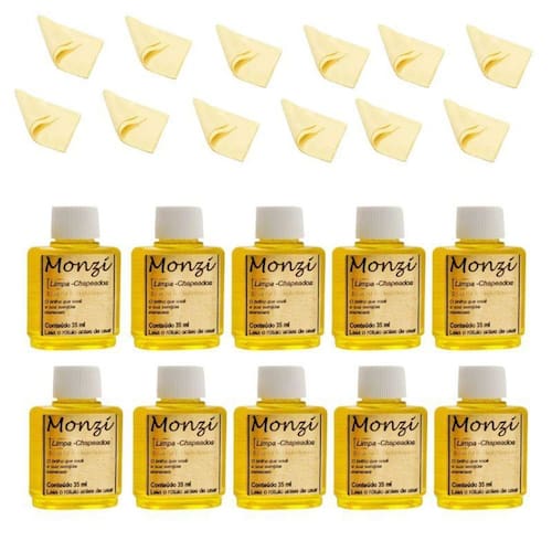 Kit 10 Limpa Chapeados Semijóias Monzi +10 Flanelas Mágicas Descrição do produto: O limpa chapeados monzi é um produto específico para limpar semijóias e fácil de usar. Atenção para o modo de usar Modo de usar: - passe o limpa chapeados monzi na semijóias banhada folheada ou cobre utilizando algodão. - enxágue em água corrente e enxugue bem com uma flanela mágica. Descarte o algodão. - para objetos maiores, utilize um recipiente de vidro ou plástico com imersão da peça por 10 segundos apenas. - lave bem o recipiente utilizado. - descarte o produto em água corrente. - não risca e nem desgasta a prataria. - limpa pratas monzi retira a oxidação e a gordura, deixando ainda, uma camada de proteção no objeto. Marca: Não Informado