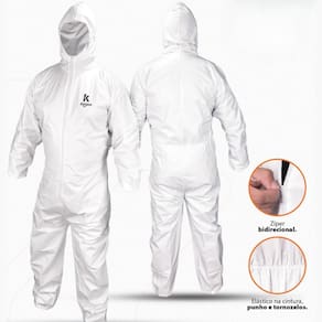 Macacão de segurança, confeccionado em tecido não tecido (TNT) de polipropileno com filme de polietileno micro poroso. Tratamento antiestético. Capuz de duas peças com elástico. Fechamento frontal com zíper bidirecional, sem aba protetora, elástico na cintura, punhos e tornozelos.