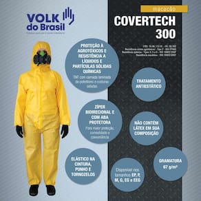 Informações técnicas Marca: Volk do Brasil Modelo: Covertech 300 Material: Tecido não tecido (TNT) com camada laminada de polietileno Tamanho: EP, P, M, G, EG, EEG Resistência química: Tipo 5 Costura: Seladas Gramatura: 67 g/m² Formato: Macacão com capuz Descartável CA: 39.182