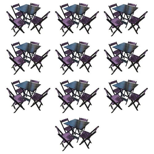 Kit 10 Mesas De Madeira Dobrável Preto 70x70 Com 4 Cadeiras Dobráveis RoxoÉ ideal para bares, restaurantes, estabelecimentos, áreas de lazer e também para sua casa. Feito em madeira maciça, seu design permite que seja encaixado em qualquer ambiente, trazendo um toque a mais para seu estabelecimento. Por ser dobrável torna-se mais fácil de guardar, manusear e limpar o produto.CaracterísticasTipo: ConjuntoModelo: dobrávelCor do tampo: Preto Base: Madeira maciçaCor do assento: RoxoDIMENSÕES DO PRODUTOMesa:Altura: 77cmLargura: 70cmComprimento: 70cmQuantidade de mesas: 10Cadeira:Altura: 77cmLargura: 43cmComprimento: 42cmQuantidade de cadeiras: 40 ATENÇÃOEVITE USAR PRODUTOS ABRASIVOS E QUÍMICOS PARA LIMPEZA DO PRODUTO, ACONSELHA-SE O USO DE PANO UMEDECIDO PARA MELHOR CONSERVAÇÃO.AS IMAGENS SÃO MERAMENTE ILUSTRATIVAS E PODEM SOFRER VARIAÇÕES DE COR E PEQUENOS DETALHES DE ACORDO COM O SEU MONITOR, ILUMINAÇÃO DO AMBIENTE E ATÉ MESMO A SUA PERCEPÇÃO VISUAL. Kit 10 Mesas de Madeira DobrÃvel Preto 70x70 com 4 Cadeiras DobrÃveis Roxo