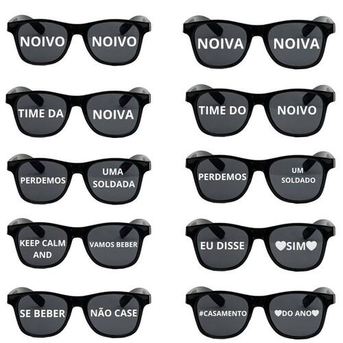 Deixe sua festa ainda mais especial e divertida com esses óculos super estilosos e descolados.- de ótima qualidade- tamanho universal- unissexobs: as frases estão escritas da seguinte maneira:- noivo-noivo-noiva-noiva-time da-noiva-time do-noivo-perdemos-uma soldada-perdemos-um soldado-keep calm and- vamos beber-eu disse-sim -se beber- não case -casamento-do ano Não será possivel fazer alteração das frases e não personalizamoseles irão completar seu look e trazer muita diversão para você e seus convidados que irão arrasar na sua festa, pois são, preto, divertidos, estilosos....Perfeitos para baladas, casamentos, festas em família ,eventos, qualquer comemoração... Marca: Não Informado