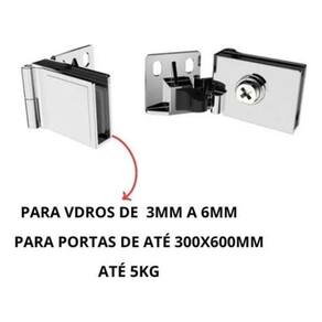 Descrição sobre o item, abaixo --------------------------- apresentamos a dobradiça para porta de vidro em aço inox, um produto rígido e resistente, que oferece segurança extra. Não é necessário fazer furações no vidro, apenas na madeira. Sua instalação é fácil e proporciona uma vedação segura. Com design discreto, é ideal para portas de vidro em ambientes residenciais, comerciais ou escritórios. Garanta qualidade e funcionalidade duradoura para suas portas com essa dobradiça de alta confiabilidade. ------------------------observações tecnicas do produto---------------------------- Material: aço inox com acabamento cromado. Indicada para portas de vidro com espessura de 3mm a 6mm. Não requer furação no vidro para sua instalação. Proteção de ventosa nos parafusos para fixação segura do vidro. Dimensões recomendadas para utilização: até 300x600mm ou peso menor a 5 kg. 1. Espessura recomendada do vidro: 3mm a 6mm. 2. Acompanha: 10 pares de dobradiças e 4 parafusos para instalação. Obs: verifique nossos outros produtos na opção ver mais dados deste vendedor e em seguida mais anúncios do vendedor para encontrar mais opções de ferramentas e acessórios que possam atender às suas necessidades.