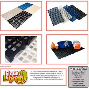 Principais aplicações: - estoques e armazenagem de carga; - almoxarifados; - baús e carrocerias de caminhões e furgões; - dormidouro ou criadouros de pequenos ou grandes animais; - decoração; - área de lazer; - sanitários, saunas e piscinas etc; - leve, prático e seguro; - se adapta em qualquer superfície plana; - formato retangular e encaixes perfeitos permite vários layouts de montagem; - sem necessidade de ferramentas para montagem; - alta vazão no escoamento de líquidos; - reciclável.
