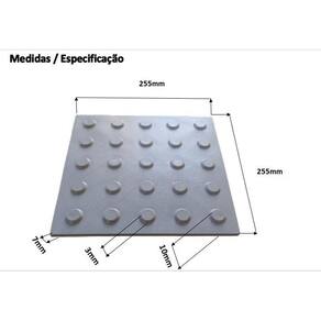 Este Kit acompanha 10 peças.O Piso da Lagge Acessibilidade possui excelente qualidade e atende as Normas NBR 9050 e NBR 16537 - Material PVC - Borracha Flexível macio e confortável ao pisar.- Medidas: 255 x 255 x 10 mm.- Aplicação: Argamassa- Não acompanha a argamassa.Piso Tátil também é conhecido como Piso Podo-tátil, são pisos criados para melhorar acessibilidade das pessoas com limitações visuais.Os Direcionais são utilizados para direcionar para locais estratégicos e os Alertas para alertar de algum obstáculo à frente. Marca: Lagge Acessibilidade