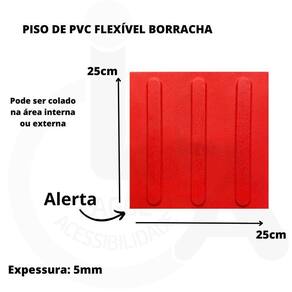 Material PVC Flexível macio e confortável ao pisar. Medidas: 250 x 250 x 5 mm. Aplicação por cola de contato uso interno e externo . Não acompanha cola.