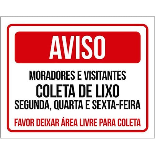 Kit 10 Placa Moradores Coleta Lixo Área Livre Coleta 36x46 Placas de sinalizaço fabricadas com poliestireno de alto impacto PSAI de 2mm e impressão ultravioleta.