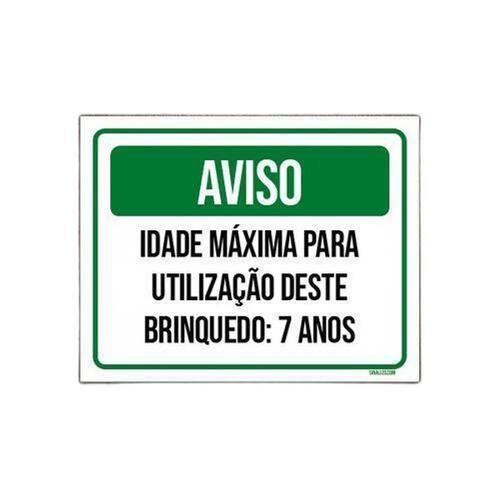 Kit 10 Placas Aviso Idade Máxima Utilização Brinquedo 7 Anos - Informações do Produto: Placas decorativas fabricadas com poliestireno de alto impacto PSAI de 2mm e adesivo vinil automotivo de alta performance. - Medidas: 18cm x 23cm - Fixação: Todas as placas possuem adesivo dupla face para aplicação em qualquer tipo de superfície lisa. Garantia de 12 meses e disponibilidade imediata. Marca: Sinalizo