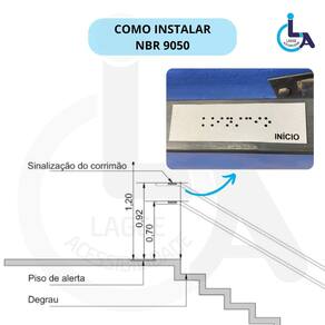 Uma solução elegante e discreta ao mesmo tempo. As placas são desenvolvidas com material anatômico, o que permite o encaixe perfeito em qualquer tipo de corrimão, seja qual for a circunferência do mesmo. Dentro da questão da instalação, a recomendação é o uso de fita dupla face, que já acompanham o produto e garante uma ótima fixação. A placa em braille para corrimão é fabricada seguindo a norma abnt nbr 9050.
