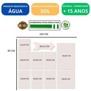 Tamanhos: 1 un Recorte Seta 35x13 cm, 6 un 20x30 cm, 1 un 30x40 cm, 1 un 30x30 cm, 1 un 20x20 cm.