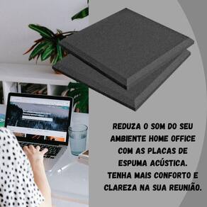 especificações dimensões: 50cm x 50cm espessura: 2cm modelo: lisa cor: cinza grafite densidade: 26 kg/m células abertas para uma boa absorção chanfrada nas bordas em 40 graus para um melhor acabamento e junção entre as placas Marca: Armazém Das Espumas