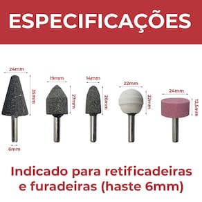 Kit 10 Pontas Montadas Rebolo Abrasivo Haste 6mm Multiuso Bravo Tools - Marca: Bravo Tools - Referência: BV1006 - Indicada para limpezas e acabamentos em superfícies - Diâmetro da haste: 6mm - 2 Ponta Cilíndrica Branca 22 x 22mm Grão Fino - 2 Ponta Tipo Roda Rosa 24 x 12,5mm Grão Médio - 2 Ponta Tipo Bala Cinza 16 x 26mm Grão Grosso - 2 Ponta Tipo Árvore Cinza 24 x 35mm Grão Grosso - 2 Ponta Tipo Cônica Cinza 19 x 27mm Grão Grosso - Material da ponta: Óxido de alumínio Corundum - As pontas montadas são indicadas para uso geral - Uso em retificadeiras e furadeiras de qualquer marca com mandril de 6mm - Indicada para afiação, esmerilhamento e desbaste em metais, joias, pedras preciosas, vidro, entre outros materiais - Ideal para trabalhos detalhados em uma variedade de superfícies, oferecendo remoção de material suave e precisa - Seu formato facilita o trabalho em locais de difícil acesso - Velocidade máxima: 25.000rpm - Peso bruto: 90 gramas - : 90 dias contra defeitos de fabricação Marca: Não Informado