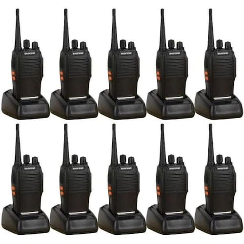 10 Rádios Comunicadores Walkie Talkie Baofeng BF-777S. 10 Baterias. 10 Fontes Carregadoras. 10 Antenas. 10 Alças de Pulso. 10 Clipes de Cinto. 10 Fones de Ouvido.