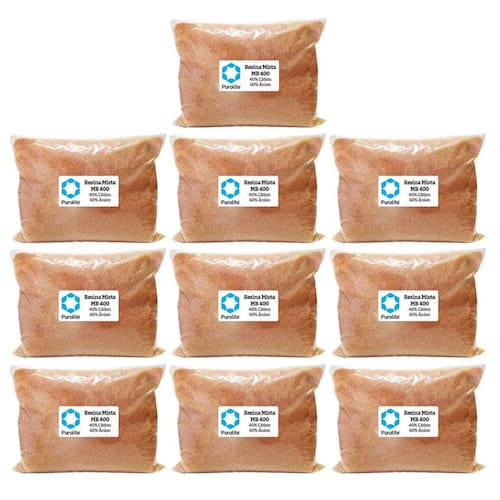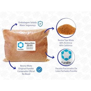 Resina mista MB400 MB 400 tem 40% Catiônica Forte e 60% Aniônica Forte - A água produzida terá condutividade média por volta de 0,1 S/cm para a maior parte da campanha, que pode ser mais extensa dependendo da qualidade final da água requerida. Produção de água desmineralizada com alta pureza, livre de sílica e Alta capacidade de produção .
