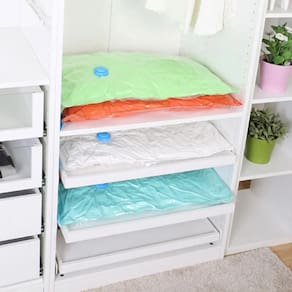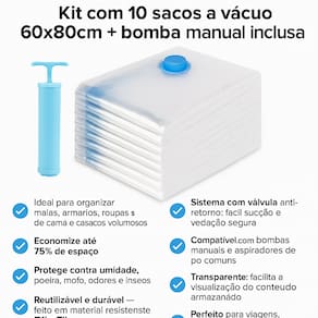 Possui sistema a vácuo que permite triplicar o espaço de armazenamento, além de ser reutilizável, impermeável e prático, protegendo suas peças da umidade, poeira, mofo, sujeira e insetos.