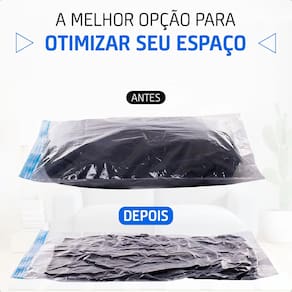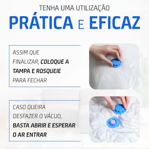 Possui sistema a vácuo que permite triplicar o espaço de armazenamento, além de ser reutilizável, impermeável e prático, protegendo suas peças da umidade, poeira, mofo, sujeira e insetos.