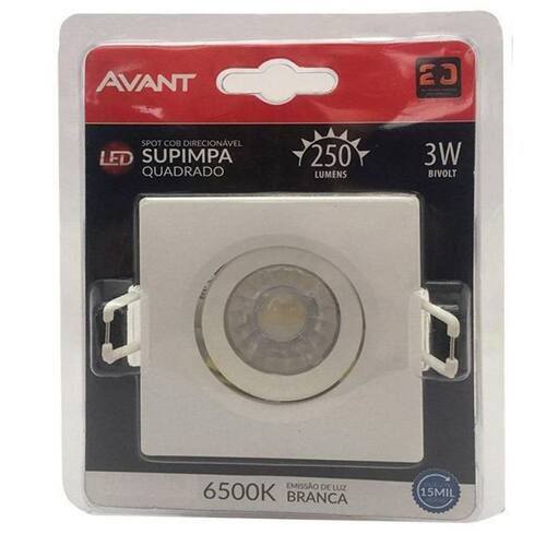 Kit 10 Spot Led Cob Quadrado 3W Avant Branco Frio Spot Led Cob Embutir Quadrado 3W Direcionável Bivolt Avant Uso embutido em teto, forros de gesso, modulares, forros de pvc, madeira e similares. Indiciado para locais internos, como apartamentos, casas, condomínios, lojas e estabelecimento comerciais. Possui sistema direcionável para melhor ajuste do seu projeto. Ideal para uso decorativo com destaque em paredes, com foco em objetos ou texturas. Potência: 3w Temperatura de Cor: 6500K Tensão: Bivolt 100 240V 127v - 47mA / 220v - 27mA Fluxo luminoso: 250lm Eficiência luminosa: 83lm/w Equivale: Halógena 25w Fator de potência: 0,50 Índice de proteção: IP20 Ângulo de abertura: 38 graus Frequência: 60Hz IRC: 70 Vida Útil: 15000h L70 Não permite dimerização Uso interno Dimensões: 70mmx70mm Peso:43g Ean: 7010646771991