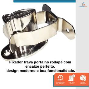 Fixador Prendedor para Travar Porta no Piso - StarferO fixador de portas Starfer é a solução para parar de bater porta!Seu corpo em aço resistente garante a durabilidade e segurança do produto.O encaixe é universal e pode ser fixado em qualquer porta e chão.Aplicação:Prendedor de portas com fixador para piso.Descrição:Fixador trava porta no rodapé com encaixe perfeito, design moderno e boa funcionalidade.Indicado para fixar a porta de forma segura, evitando que a porta bata repentinamente.Comprimento dele encaixado: 6,5cmAtenção:Não acompanha buchas e parafusos de fixaçãoDados Técnicos:• Fixador de porta para piso• Fabricado em aço resistente• NiqueladoEmbalagem: 10 conjuntosMarca: StarferRef.: 06097510