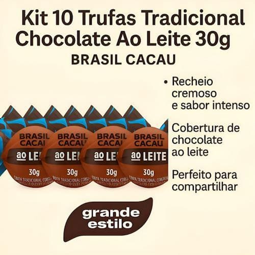Kit 10 Trufas Tradicional Chocolate Ao Leite 30g Brasil Cacau - Sabor Clássico em Grande Estilo Mais sabor, mais prazer e muito mais momentos especiais O Kit com 10 Trufas Tradicional Brasil Cacau é a escolha certa para quem ama chocolate ao leite cremoso e não abre mão da qualidade. Cada trufa traz o recheio macio e marcante, envolvido por uma cobertura generosa de chocolate ao leite, proporcionando uma experiência irresistível a cada mordida. Destaques do Kit: 10 unidades de 30g cada total 300g Recheio cremoso e sabor intenso Cobertura de chocolate ao leite irresistível Marca Brasil Cacau - tradição em chocolates sofisticados Ideal para: Presentear com impacto e generosidade Adoçar confraternizações e eventos Garantir de felicidade em forma de chocolate Garanta já o seu kit e desfrute do clássico em dose ainda mais especial Marca: Não Informado Ean: 7909737736721