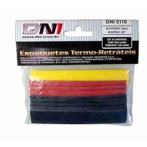 Espaguete TermoRetrátil DNI5110 10 Unidades de Ø10mm O Espaguete Termo Retrátil é produzido a partir da poliolefina, um tipo de material inerte quimicamente e com decrescente força quando em altas temperaturas, possuindo a finalidade de realizar a vedação e o isolamento dos mais diferenciados fios e cabos elétricos hoje utilizados. Com finalidade extremamente ampla o Espaguete Termo Retrátil pode ser utilizado no ramo automotivo, pontas de cabos, conectores, equipamentos eletrônicos e diversos outros casos para realizar emendas e outras aplicações. O Espaguete Termo Retrátil é um componente que sofre alteração em seu corpo sempre que exposto ao calor, seja de chamas, ar quente ou outros equipamentos, possuindo a capacidade de reduzir seu diâmetro até a metade do tamanho , fazendo a isolação perfeita do fio elétrico. Importante destacar que o Espaguete Termo Retrátil é ideal para aumentar a segurança das emendas e fios elétricos. Adquira já seu Espaguete Termo Retrátil e garanta maior segurança e profissionalidade às suas instalações. Especificações Técnicas: Espaguete Termo Retrátil; Espaguete Retrátil / Termo contrátil; Tubo Termo Retrátil; Ideal para vedação e isolamento de fios e cabos elétricos; Quando exposto ao calor sofre redução de até 50%; Aumenta a segurança de emendas e fios elétricos. Aplicável em emendas de fios, chicotes, terminais e conectores; Isola e veda conexões elétricas; Evita umidade e oxidação na aplicações, resistente a U.V; Contração 2:1; Isolação: Resistente a U.V; Temperatura de contração: 90°C; AutoExtinguível; Diâmetro interno aprox.: 10mm; Diâmetro Aprox. em Polegadas.: Ø3/8. Temperatura máxima de aquecimento: 125°; Voltagem máxima de transporte: 600V; Conteúdo da Embalagem: Kit com 10 unidades cortadas em tiras de 10cm. total 1,0m ; Kit com cores : Preto, Vermelho, Azul, Amarelo. Ean: 7896562151105