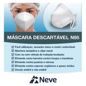Kit com 10 unidadesProteja-se com a Máscara Descartável Neve N95 PFF2-S, uma escolha ideal para quem busca segurança e conforto em ambientes com risco de exposição a agentes biológicos. Esta máscara é projetada para oferecer proteção eficaz das vias respiratórias, sendo especialmente indicada para procedimentos que envolvem risco de projeções de fluidos corpóreos potencialmente contagiosos.**Especificações Técnicas:**- Registro ANVISA: 81855830032- Cor: Branca- Classe: N95 / PFF2-S- Formato: Anatômico- Tamanho: Único- Validade: 5 anos**Funções e Características:**A Máscara Neve N95 PFF2-S é um dispositivo semi facial que filtra partículas, garantindo a proteção das vias respiratórias. Seu filtro é altamente eficiente na retenção de contaminantes na forma de aerossóis, proporcionando uma barreira segura contra agentes biológicos. Além disso, é hipoalergênica e atóxica, assegurando conforto durante o uso prolongado.**Itens Incluídos:**- 1 Máscara Descartável Neve N95 PFF2-S Branca**Compatibilidade/Para Quem É:**Ideal para profissionais de saúde e qualquer pessoa que necessite de proteção respiratória em ambientes de risco. A máscara é adequada para uso em hospitais, clínicas, laboratórios e outros locais onde a exposição a agentes biológicos é uma preocupação.**Benefícios do Produto:**- Proteção eficaz contra agentes biológicos- Design anatômico que se ajusta confortavelmente ao rosto- Material hipoalergênico e atóxico para maior conforto- Filtro eficiente para retenção de aerossóis**Instruções de Uso:**Para garantir a máxima proteção, ajuste a máscara corretamente ao rosto, cobrindo o nariz e a boca. Certifique-se de que não há espaços entre a máscara e o rosto. Descarte a máscara após o uso ou se ela estiver danificada ou suja.**Q&A (Perguntas e Respostas):**- **Esta máscara possui válvula?**  Não, a Máscara Neve N95 PFF2-S não possui válvula, o que a torna adequada para ambientes onde a filtragem de saída de ar é necessária.- **Qual é a validade da máscara?**  A máscara possui validade de 5 anos, desde que armazenada em condições adequadas.- **É reutilizável?**  Não, esta máscara é descartável e deve ser descartada após o uso.Escolha a Máscara Descartável Neve N95 PFF2-S Branca para garantir a proteção necessária em ambientes de risco, com a qualidade e segurança que você merece.