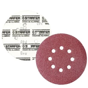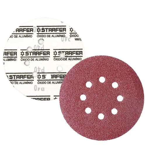 CARACTERÍSTICAS TÉCNICAS: Material: Resina, óxido de alumínio, papel e pluma Medidas: 115mm Quantidade de furos: 8 Limite máxima: 12.220rpm - 80m/s Grão: 40 Quantidade: 100 unidades Marca: Starfer Ref.: 4000005