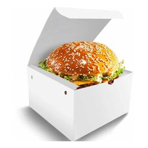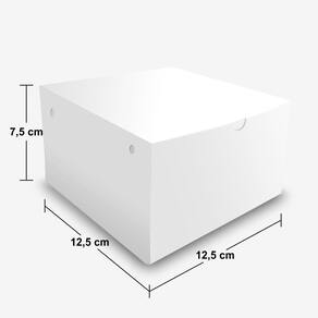 Descrição da embalagem box para hambúrguer Dimensões: 7,5cm x 12,5cm x 12,5cm (axlxc) Modelo: branco Material: cartão triplex Itens inclusos: 100 unidades