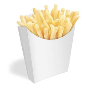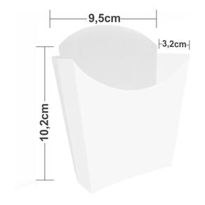 Descrição da caixinha para batata frita Dimensões: 10,2cm x 3,2cm x 9,5cm (axlxc) Modelo: branco Material: cartão triplex Itens inclusos: 100 unidades