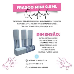 Altura do frasco: 4.1 CM Altura da tampa: 3.3 cm Altura fechado: 7.5 cm Circunferência: 6.8 cm Diâmetro: 1,8 cm Capacidade: 2,5 ml Material: Plástico Sangel