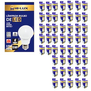 100 - LÂMPADAS LED BULBO 15W 6500KA linha de lâmpadas LED HILUX é indicada para retrofit de lâmpadas incandescentes ou fluorescentes, em diversos tipos de aplicações para ambientes internos.PROPRIEDADES¿ Lâmpadas certificadas pelo INMETRO.¿ Formato similar às lâmpadas incandescentes tradicionais.¿ Corpo em policarbonato branco e difusor em policarbonato branco leitoso.¿ Possui driver interno isolado.CARACTERÍSTICAS DE FUNCIONAMENTO¿ Temperatura ambiente: -5°C a 40°C.¿ Tensão de entrada: 100V a 240V.ESPECIFICAÇÕES TÉCNICAS¿ Base : E27¿ Tensão : Bivolt Automático 100V - 240V¿ Ângulo de abertura : 180 graus¿ Potência : 15W¿ Fluxo Luminoso : 1350 Lumens¿ Temperatura de cor : 6500K¿ Emissão de cor : Branca¿ Equivalência : Incandescente 75w / Fluorescente 20W¿ Dimensões : 108mm x 60mm