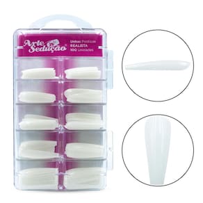 01 - Caixa Acrílica com 100 Unidades de Unhas Postiças Formato Realista Leitosa, Arte Sedução